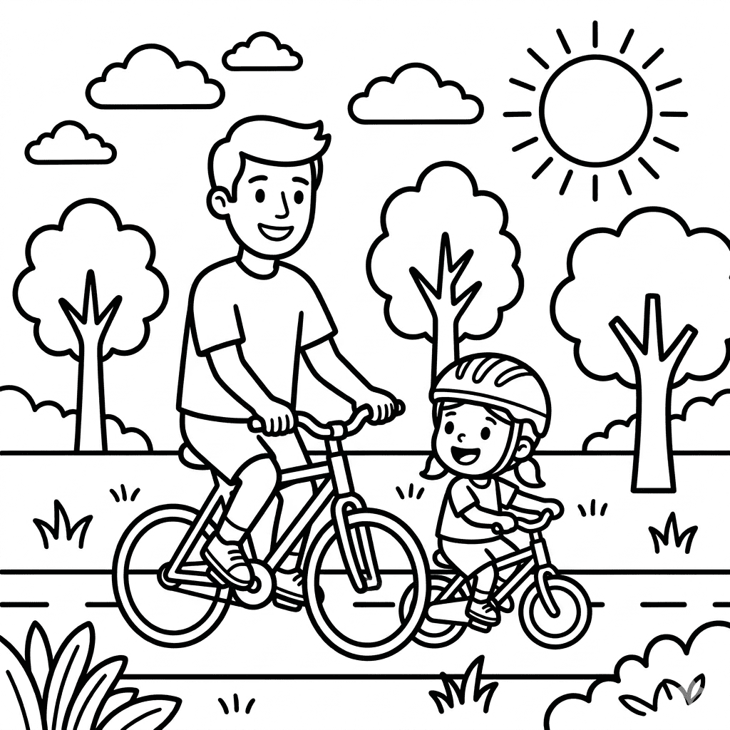 These are among the best Father's Day coloring pages for daughters to gift to dad. Each design shows a real bonding activity — kite flying, bicycle rides, park walks, reading, and piggyback rides — so a finished, colored page is a genuinely personal and meaningful gift.