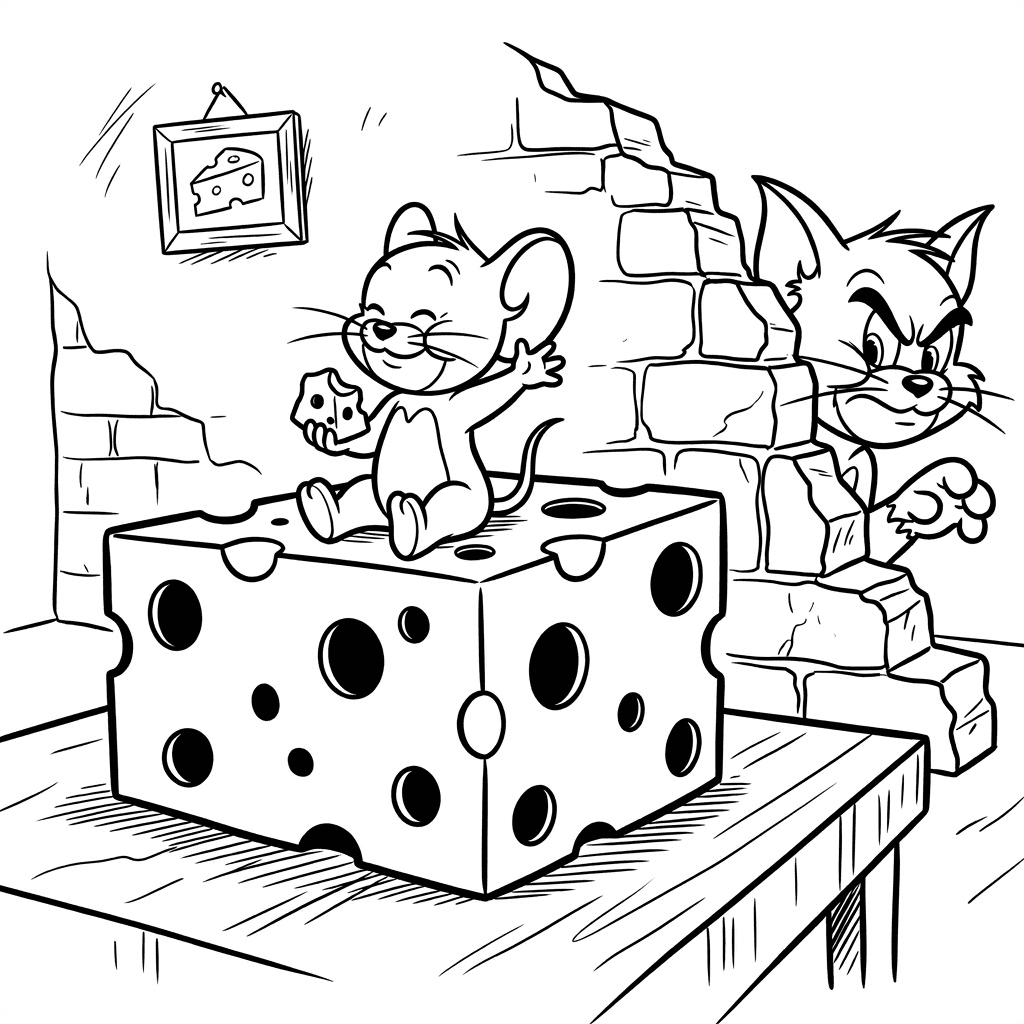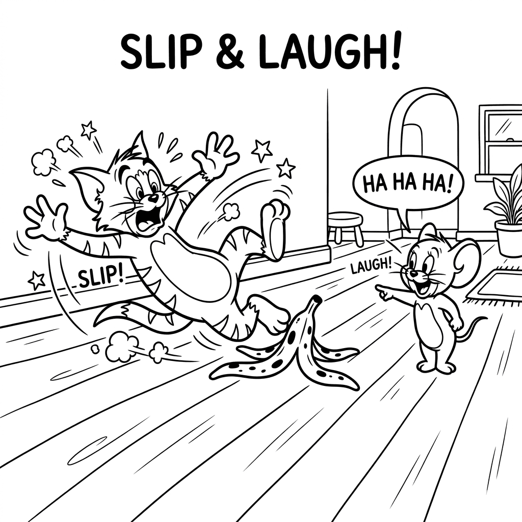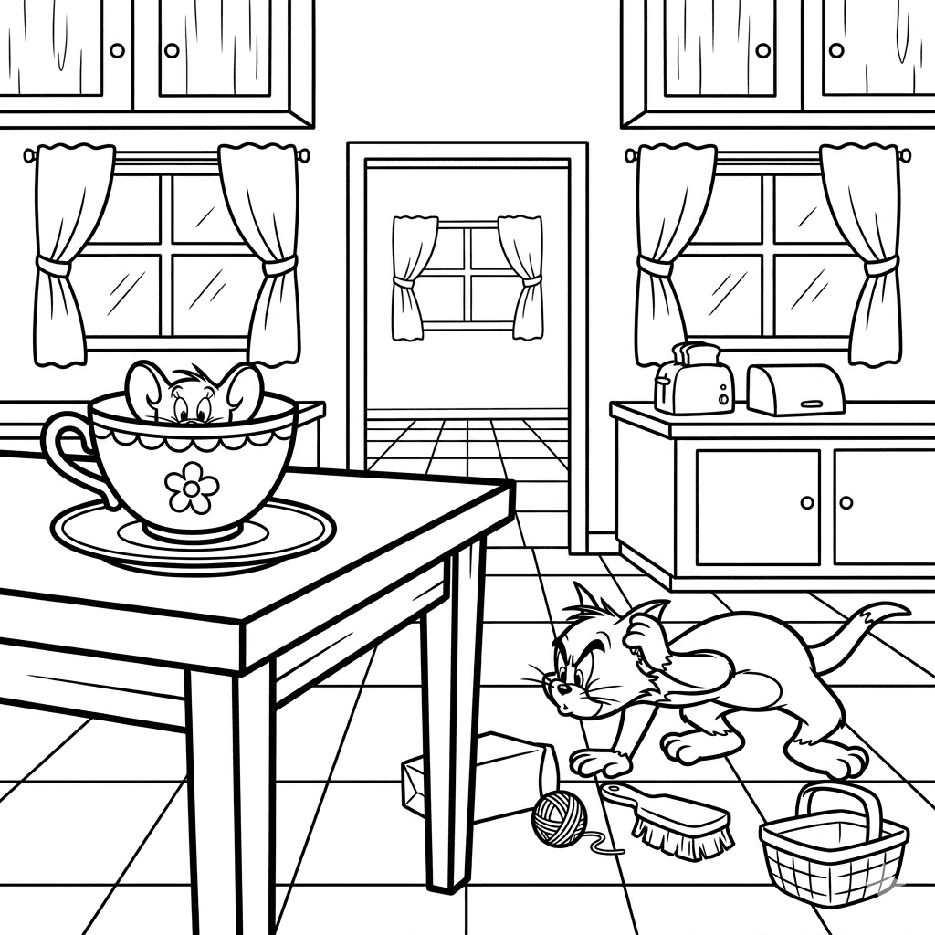 Enjoy 10 free printable Tom and Jerry coloring pages featuring classic chase scenes: Jerry hiding in a teacup, Jerry on cheese, playing in the park, living room chase, and the famous banana peel slip. Print or color online. No signup, no cost!